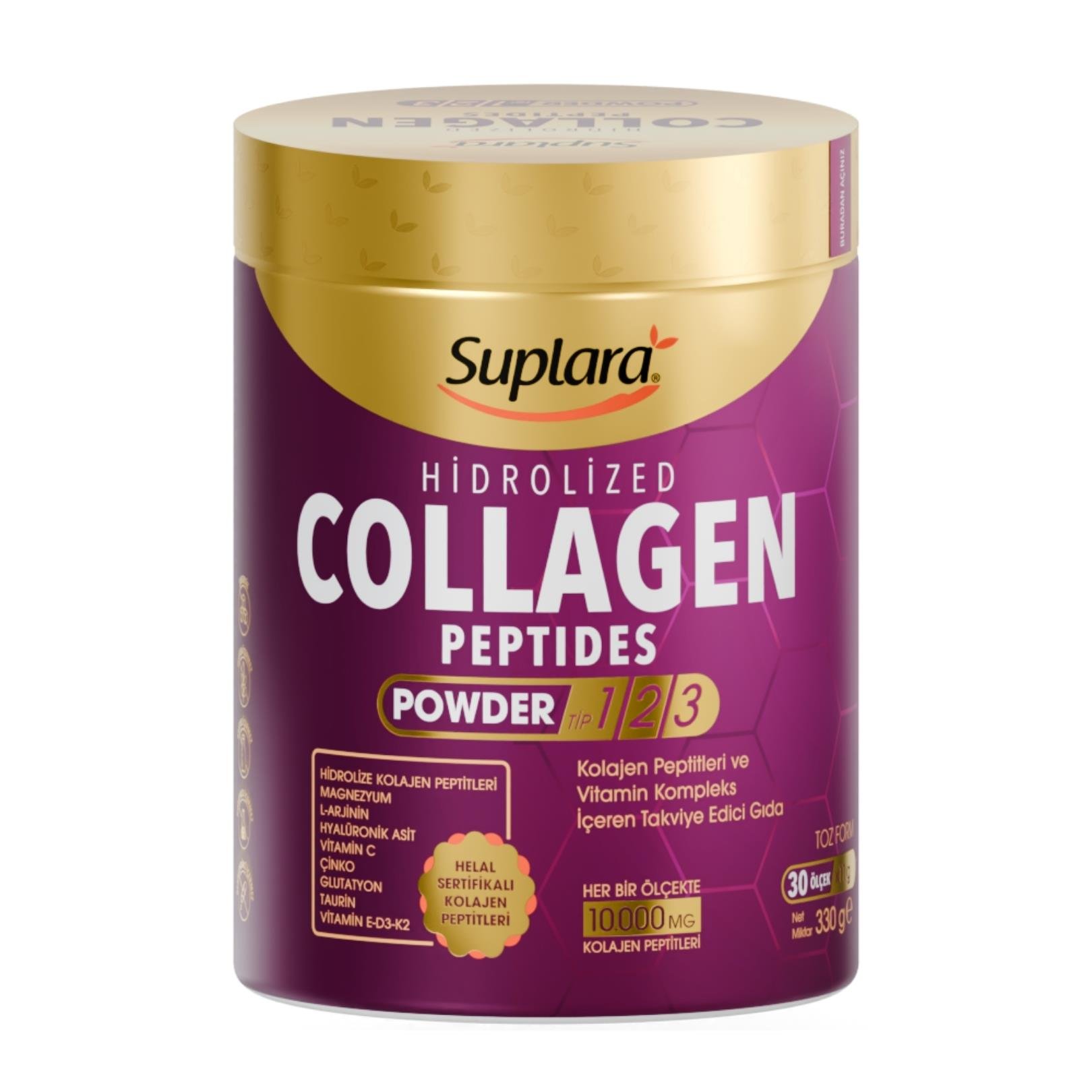 Suplara Hidrolized Collagen Peptıdes Powder, her 1 ölçekte 10,000 mg Tip 1/2/3 kolajen peptitleri, vitamin kompleks içeren, toz formda gıda takviyesidir.